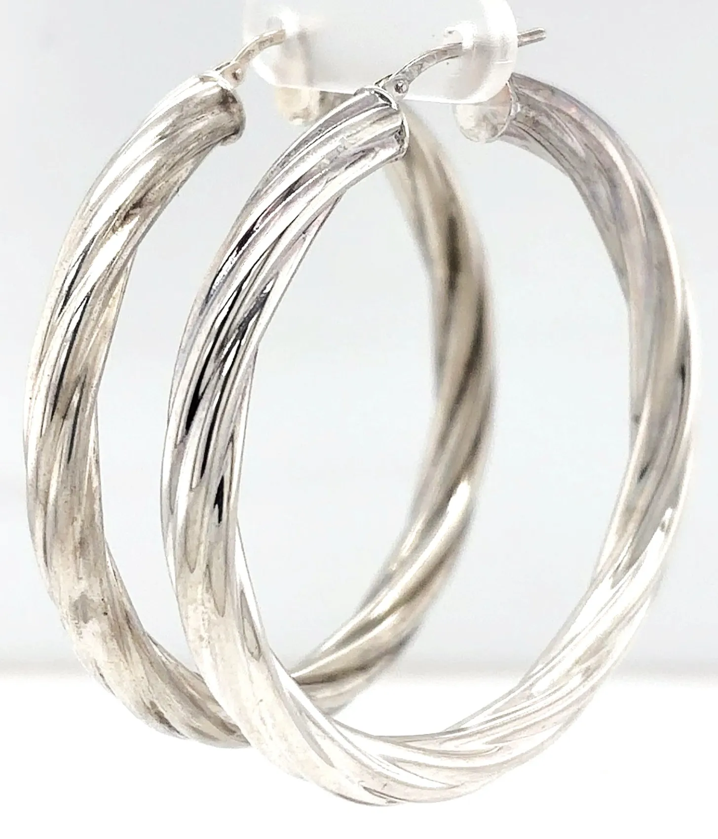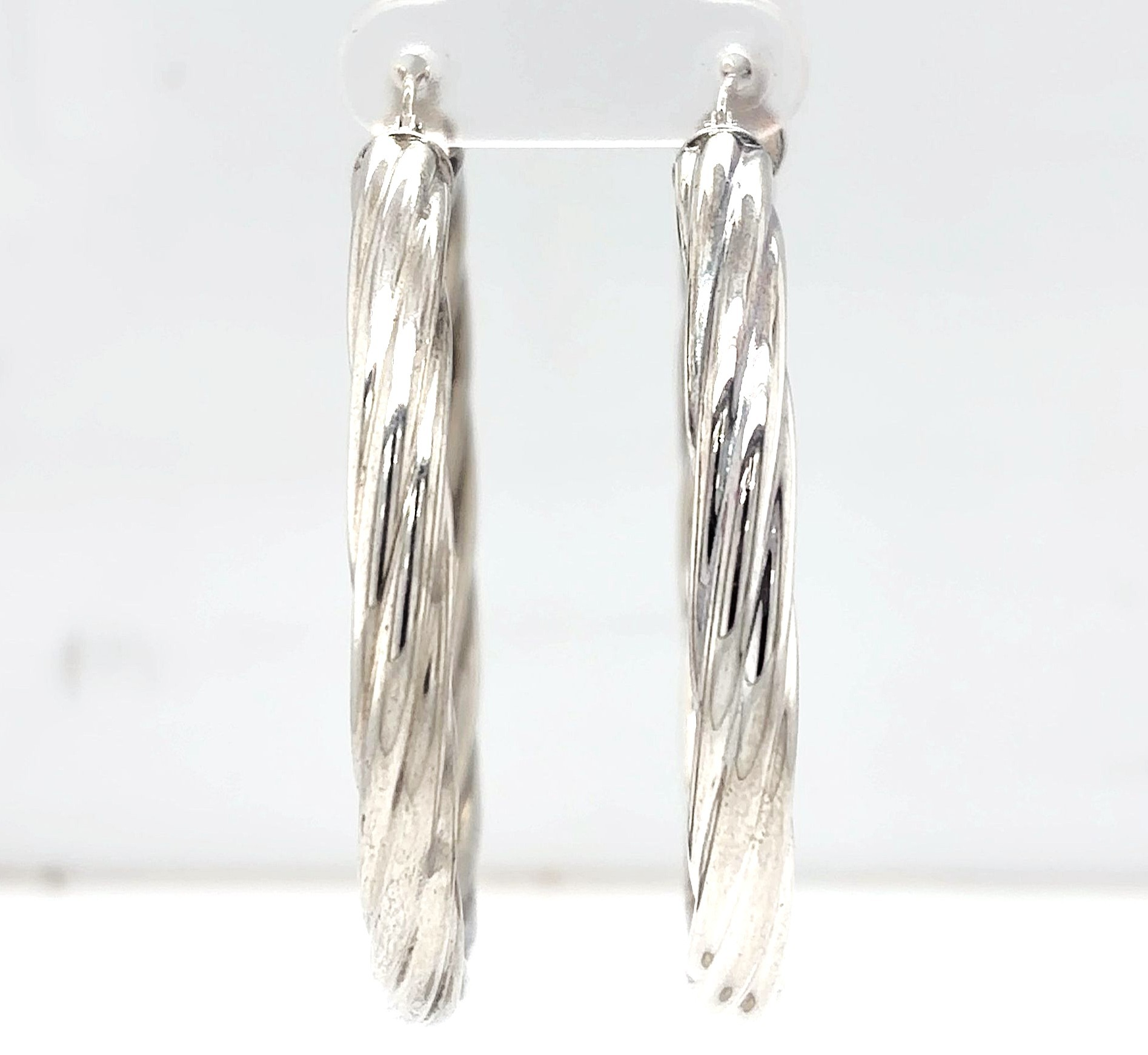 Striking and elegant, these sterling silver large twisted hoop earrings feature a beautifully sculpted twist design that adds texture and dimension to a timeless hoop silhouette. Their bold 50mm diameter creates a confident statement while maintaining refined sophistication. Crafted from solid sterling silver, the earrings weigh 10.8 grams and measure 50mm x 50mm x 5.0mm, offering a substantial yet balanced feel. The polished twisted finish catches the light from every angle, making them perfect for both daytime styling and evening wear. A standout addition to any jewellery collection, these large silver hoops are ideal for those who appreciate classic designs with a contemporary edge.