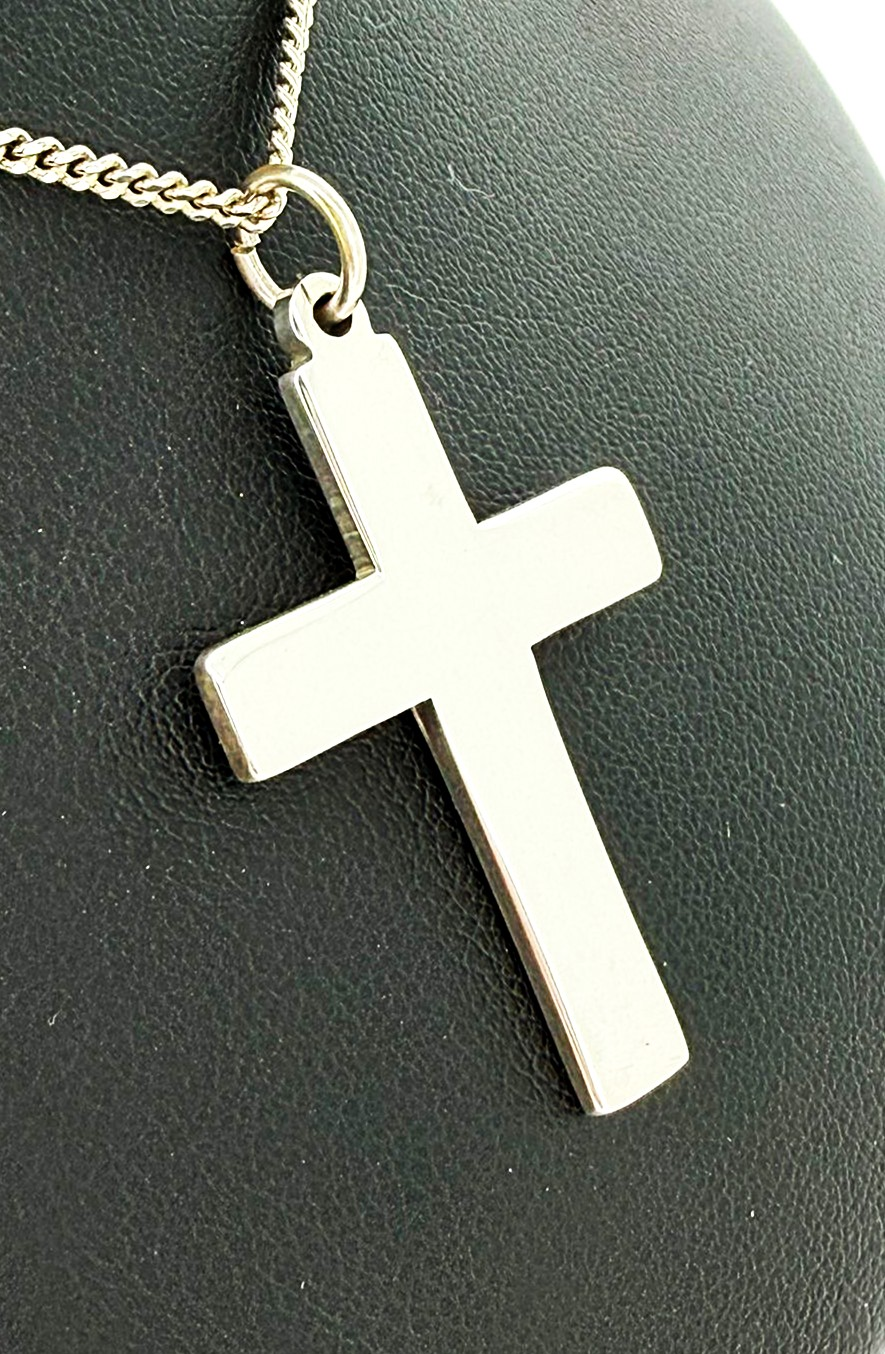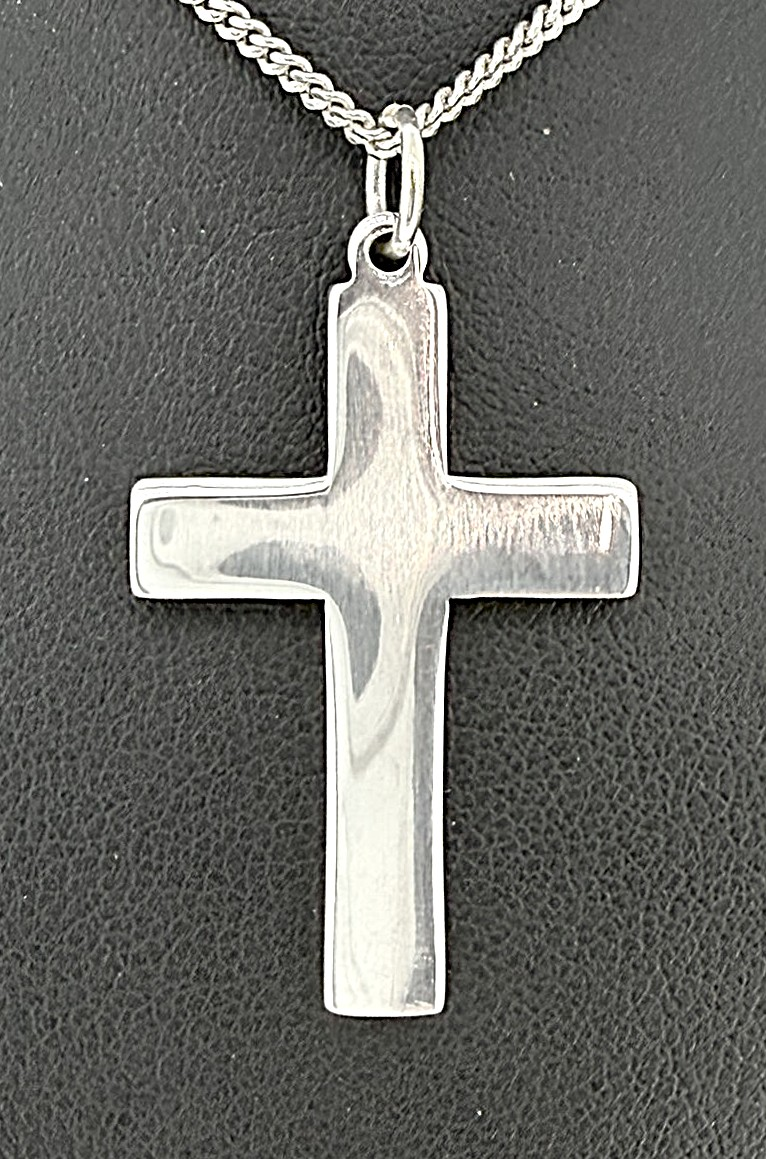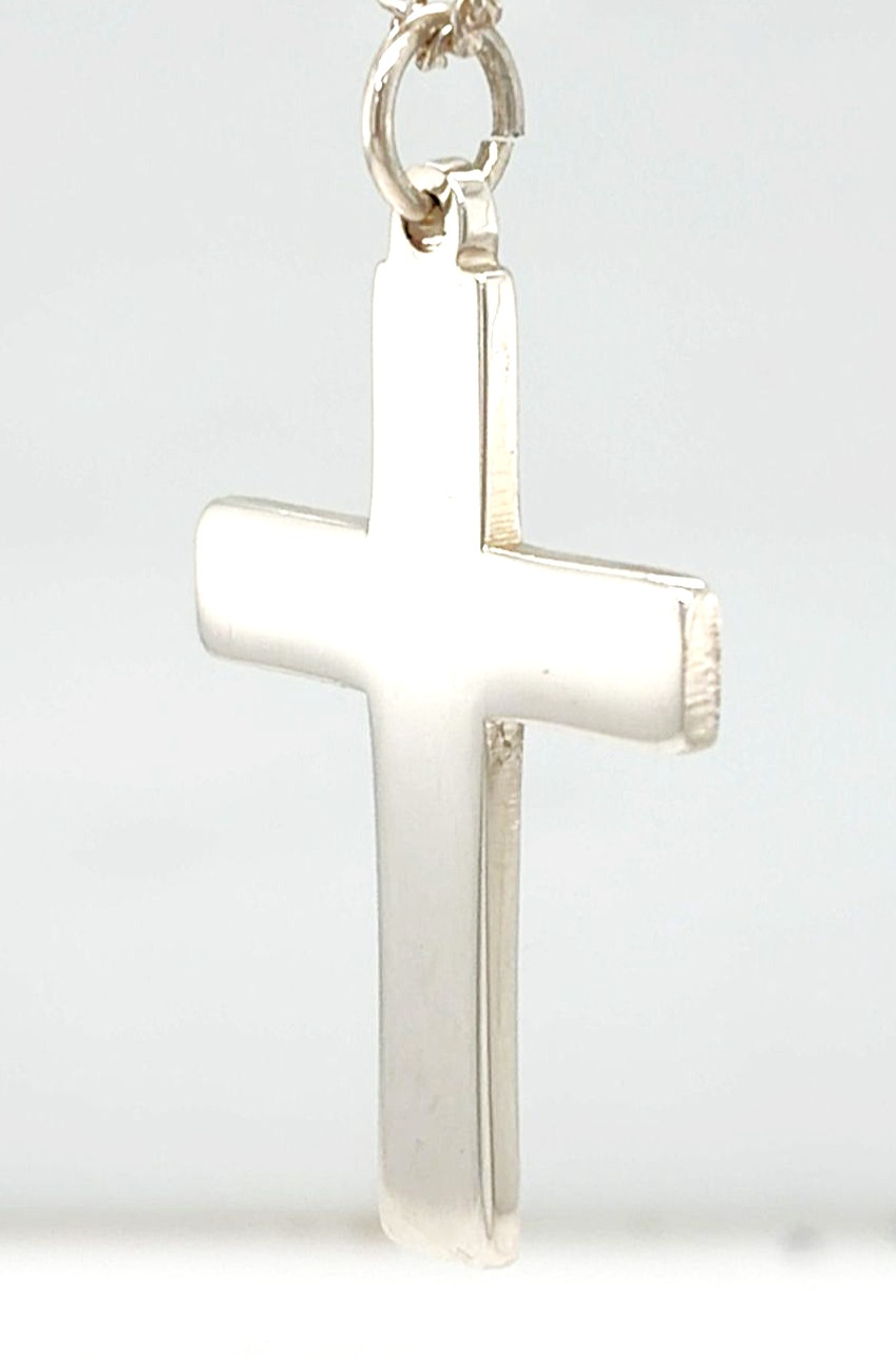 Timeless and understated, this sterling silver plain cross pendant features a clean, classic design with a smooth polished finish. Its simple silhouette makes it a versatile piece, suitable for everyday wear or special occasions. Crafted from high-quality 925 sterling silver, the pendant weighs 5.2 grams and measures 35mm x 25mm x 2.0mm, giving it a solid yet comfortable feel. The balanced proportions offer a refined look that complements a wide range of chain styles. A meaningful symbol of faith, this plain cross pendant makes a thoughtful gift for christenings, confirmations, birthdays, or as a timeless personal keepsake.